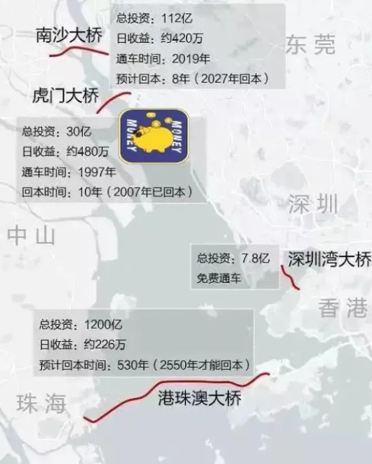 而深圳周边修的几座桥,南沙大桥回本周期8年,虎门大桥回本周期10年,完完全全的吊打港珠澳大桥。