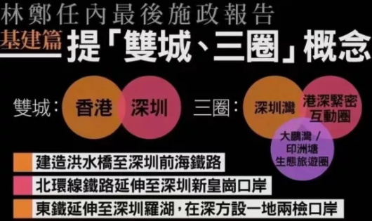 而如今,香港特首宣布将兴建北部都会区,全力开发靠近深圳一侧的土地,提出双城三圈概念,把未来几十年香港的经济增量、人口增量、科技增量全部押宝在了这里。