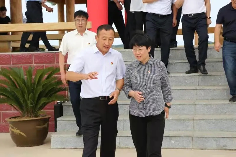 【时任烟台市委组织部长于涛和福山南庄村党支部书记彭利民(左)交谈】