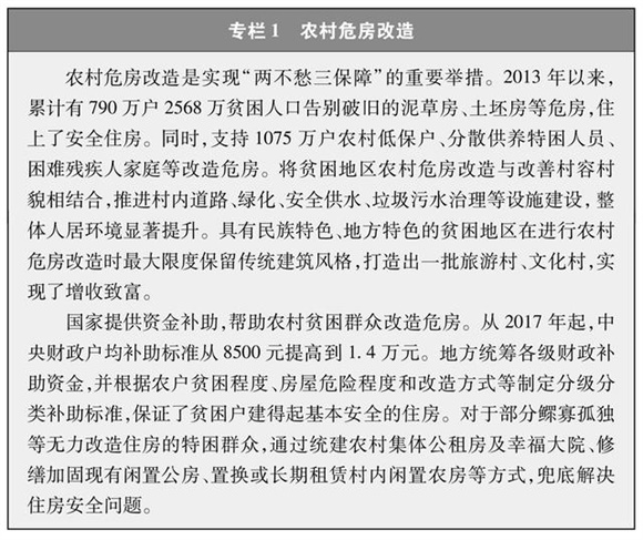 “两不愁三保障”全面实现。脱贫攻坚普查⑧显示,贫困户全面实现不愁吃、不愁穿,平时吃得饱且能适当吃好,一年四季都有应季的换洗衣物和御寒被褥。贫困人口受教育的机会显著增多、水平持续提高,农村贫困家庭子女义务教育阶段辍学问题实现动态清零,2020年贫困县九年义务教育巩固率达到94.8%。持续完善县乡村三级医疗卫生服务体系,把贫困人口全部纳入基本医疗保险、大病保险、医疗救助三重制度保障范围,实施大病集中救治、慢病签约管理、重病兜底保障等措施,99.9%以上的贫困人口参加基本医疗保险,全面实现贫困人口看病有地方、有医生、有医疗保险制度保障,看病难、看病贵问题有效解决。实施农村危房改造,贫困人口全面实现住房安全有保障(专栏1)。实施农村饮水安全和巩固提升工程,累计解决2889万贫困人口的饮水安全问题,饮用水量和水质全部达标,3.82亿农村人口受益;贫困地区自来水普及率从2015年的70%提高到2020年的83%。