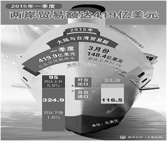 2021年1月8日台当局公布,2020年台湾对大陆出口额达1514.52亿美元,创历年新高,同比增长14.6%,占台湾总出口额的43.9%。大陆稳居台湾地区最大出口市场和最大顺差来源地。2020年台湾总出口额为3452.76亿美元,同比增加4.9%;进口额2864.86亿美元,同比增长0.3%,贸易顺差587.9亿美元。