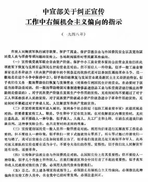 这种偏向,70多年前党中央就明文纠正过——1948年《中宣部关于纠正宣传工作中的右倾机会主义偏向的指示》曾强调: