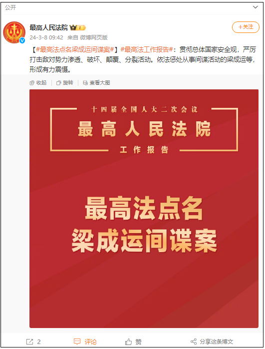 此外,据@最高人民法院 3月8日消息,最高法工作报告显示,贯彻总体国家安全观,严厉打击敌对势力渗透、破坏、颠覆、分裂活动。依法惩处从事间谍活动的梁成运等,形成有力震慑。