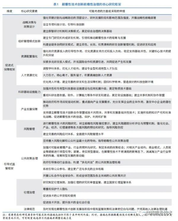 基于颠覆性技术发展的全周期,提出前瞻性治理的核心研究框架(表 1),目标是保障和激励颠覆性技术创新和应用的发展,尽可能降低不确定性和风险,疏导技术颠覆性变革替代所带来的不适应和代价,帮助社会稳步过渡和加快发展。前瞻性治理框架包括促进式保障和引导式监管 2 个维度。促进式保障框架。根据预判技术发展可能带来的重大有益变革,设计有利于技术创新产生、培育、孵化和应用的促进式保障要素,包括创新价值链全链条涉及的战略决策与政策设计、组织管理模式创新、资源配置、人才资源、基础设施、产业发展保障等。引导式监管框架。根据预估技术发展的不确定性和风险,判断可能引发的安全、伦理和社会问题,设计从风险管理、公共政策治理、伦理治理到法律规范的引导式监管要素。