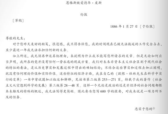 以上就是恩格斯给爱德华·皮斯回信的全文。笔者认为,恩格斯在这封信里,显然没有否认马克思和他关于未来社会基本特征看法之意。恩格斯这封信的主要内容是要拒绝爱德华·皮斯要他就未来社会的看法写600字概述的请求。