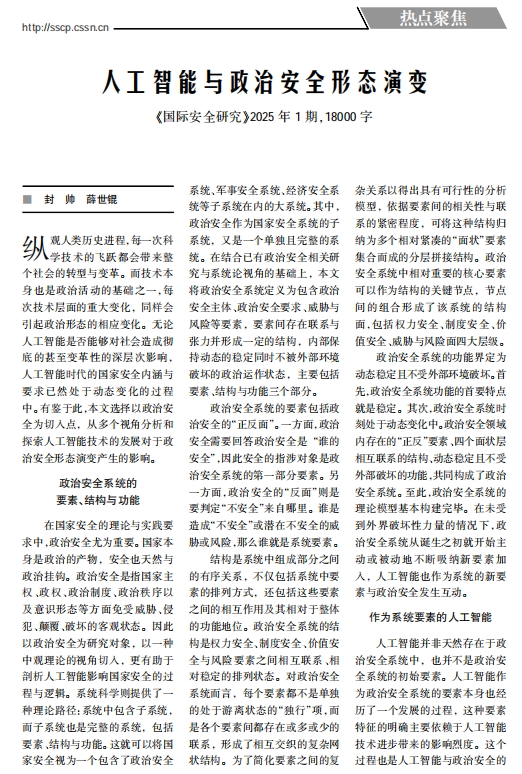 作者:封帅 薛世锟,作者单位:上海国际问题研究院网络空间国际治理研究中心 上海国际问题研究院,原题《人工智能与政治安全形态演变:一项系统研究的尝试》,摘自《国际安全研究》2025年1期;来源:《中国社会科学文摘》2025年第5期P9—P10