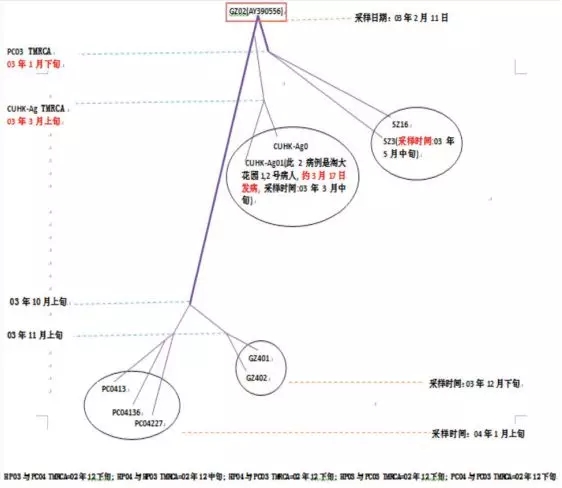 1:TMRCA(Time of Most Recent Common Ancestor):最近共同祖先时间; 2:左侧时间:为外群GZ02和各组之间TMRCA,或HP04与PC04之间TMRCA,或HP04或PC04 TMRCA:由水平虚线(……)指向发育树分枝节点; 3:下端时间:为两个组之间TMRCA,除“PC04与PC03=03.1中”在图中未表示外,均由发育树树根处可见; 4:TMRCA具体时间的缩写:如GZ02:02、12上,表示2002-12上旬。