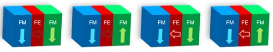 多铁隧道结作为多铁性材料应用的典型代表,多为铁磁/铁电(多铁)/铁磁三明治结构(如图6),是发展新型信息存储器的重要方向之一。两端的铁磁电极(FM)的磁化方向受磁场控制,而中间的铁电电极(FE)的极化方向受电场控制。由于多铁隧道结同时具备磁性隧道结的TMR效应和铁电隧道结的TER效应,因此,通过磁场和电场的控制可以达到四种不同的阻态。