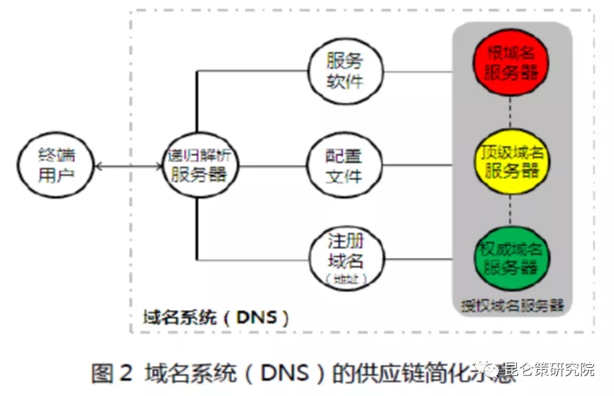 习近平总书记在2020年9月的科学家座谈会上指出:我国面临的很多“卡脖子”技术问题,根子是基础理论研究跟不上,源头和底层的东西没有搞清楚。域名空间是一个生态系统(ecosystem),其服务体系如图1所示,其中“递归域名解析服务器”是域名空间的入口:虽然域名根服务器在域名解析服务中是一个重要的环节,但在域名空间中仅当各个环节相互依存,方能构成一个能够可靠运行的生态系统。反之,任何一个环节出现安全问题,都可能导致域名解析服务中断(“断服”),或是网络瘫痪(“断网”)。据美国国防部术语词典的定义,“供应链”(Supply Chain)是:从原材料到向最终用户提供成品和服务相关联的(人的)活动。域名空间的生态系统可以被简化为一个“供应链”(图2)。从图1 和图2 可见,域名空间是一个复杂的生态系统。而应对“断网”的风险和隐患的本质是:供应链的安全和保障问题。因此,有必要澄清域名空间供应链中的五个重要的关联事实:事实1:镜像的域名根服务器不能替代13个域名根系统;事实2:镜像的域名根服务器采集的数据绝大多数是“垃圾”;事实3:镜像的域名根服务器采集的是不完整和不确定数据;