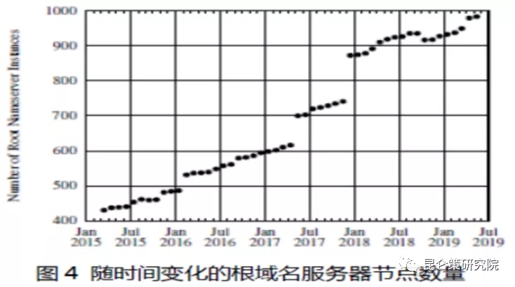 1)根提示文件(Root Hints File):当前,最终用户设备通常将所有DNS查询发送到递归解析服务器,该解析服务器在加入网络时通过DHCP配置。或者,用户可以将其设备配置为利用公共递归域名解析服务器(例如Google的8.8.8.8服务器)。递归域名解析服务器查询授权的域名服务器,使用所谓的“根提示文件”引导查找授权域名服务器的过程。根提示文件包含所有13个命名的授权域名根服务器的列表,它们表示为a-root到m-root。对于每个命名的根,文件都包括域名服务器(NS记录),以及域名服务器的IPv4地址(A记录)和IPv6 地址(AAAA 记录)。因此,根提示文件共有39个条目,大约3KB(3000字节)。例如,A 根:有了这些信息,递归解析服务器可以从根开始查询过程,并按照DNS响应中的指示进行。例如,来自根名称服务器的响应将指示递归解析服务器联系指定的顶级域名(TLD)服务器。根提示文件中的每个记录的缓存时间(TTL)为360万秒(约42天)。该文件在很大程度上是静态的,但在某些情况下确实会发生变化,并且递归解析程序应在根提示文件缓存时间到期后获得一个新副本。分析表明,大量的递归域名解析服务器不会及时地更新其根提示文件。每个域名根服务器均根据根区文件的副本响应查询。该副本由因特网域名与数字地址分配机构(ICANN)官方提供,由Verisign公司分发。域名根服务器不会直接响应查询请求,而是会将域名查询的请求引导向顶级域名服务器,以获取查询域名中顶级域名的主机。例如,对“www.ccb.com”的查询请求,域名根服务器将请求引导向“.com”的授权顶级域名服务器,继而将请求引导向“ccb.com”的权威域名服务器。自2009年4月28日以来,研究人员每天在根区文件中存档一个记录。图3显示了每月15号在根区中的记录数。该图显示,经过一段时间的稳定之后,根区文件中的记录数量在2014年初至2017年初之间增长了五倍。这是由于顶级域名(TLD)数量增加所致,而2013年6月15日为317个TLD在2017年6月15日达到1,534个TLD。经过这段时期的增长,规模已稳定到大约22,000个。当前的根区文件大约为2.1MB(兆字节)。目前, 根区文件中的NS,A和AAAA记录的TTL为两天(172,800秒)。因此,递归解析服务器可以缓存来自域名根服务器的响应,并在两天之内继续使用,以响应来自终端用户设备的域名查询请求,而无须访问顶级域名服务器,故不存在所谓的域名解析服务的“加速”(speed up)。根区文件是公开的,可以下载(约2.1兆字节)。其中的顶级域名(TLD)包括:国家/地区顶级域名(ccTLD),通用顶级域名(gTLD),新通用顶级域名(ngTLD),会经常发生变化,或更改域名服务器集(域名或IP地址)。相应的问题是:如何确定根区文件是更新的?此外,DNSSEC规范的主要作用是,当对根区文件中的所有记录进行验证时,需要一个根区DNSSEC密钥的副本,密钥随着时间而改变。故另一个问题是:如何确保根区文件内容的真实性?因此,获取根区文件并不难,而重要的是:根区文件内容的合规性和可用性受到验证和约束,不允许“为所欲为”。虽然只有13个命名的授权域名根服务器系统, 但是每个命名的域名根服务器系统都通过任播(Anycast)路由设置,由多个“副本”(设置的站点和节点)组成。在2019年5月15日,统计了985个域名根服务器节点。图4显示了自2015年3月以来每个月15日的节点数量。由e-根和f-根引起的节点数量有几次大跳跃:(a)在2016年1月至2月之间,e-根增加了45个节点,