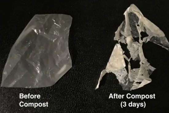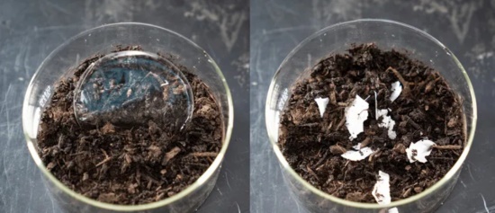 图 | 左侧的改性塑料,在标准堆肥中仅放置三天就会分解,而在两周后会完全分解(来源:受访者)