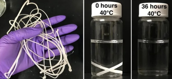 如下图所示,使用本次技术,在 40℃ 的环境下,这种塑料能在 36 小时后、也就是一天半之后降解为小分子。
