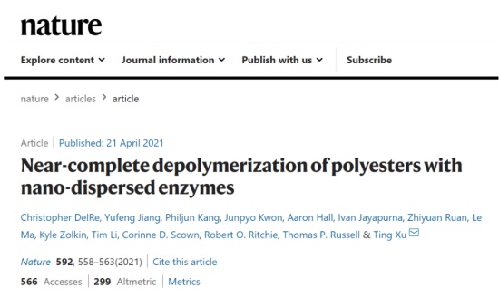 当天,徐婷担任通讯作者的论文在 Nature 发表,论文标题为《聚酯与纳米分散酶几乎完全解聚》“Near-complete depolymerization of polyesters with nano-dispersed enzymes”。