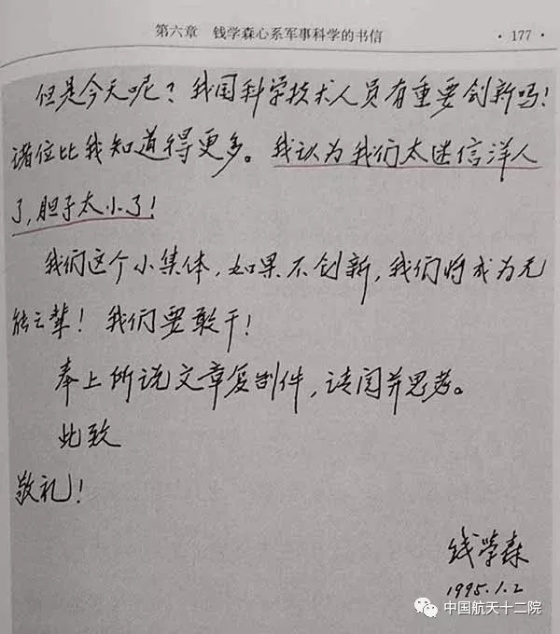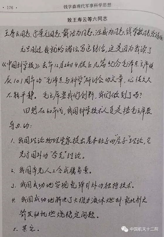 钱学森的信写给了王寿云(时任国防科工委科技委正军职常委兼秘书长)、于景元(原航天工业部710研究所副所长)等六同志,他在信中问道:“毛主席要我们创新,我们做到了吗?”“