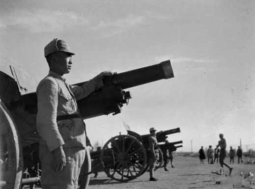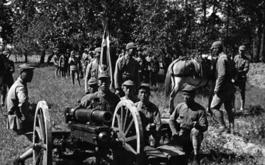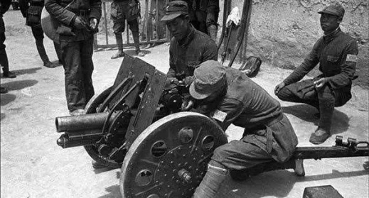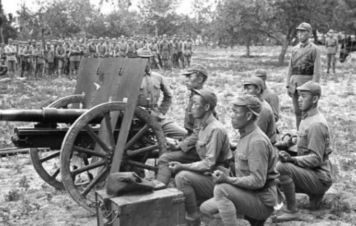 【1937年陕北的工农红军抗日先锋队装备的一门日制四一式75毫米山炮,当时陕北红军的军帽是一种小军帽,因外形类似日军的黄色军便帽经常被混淆】