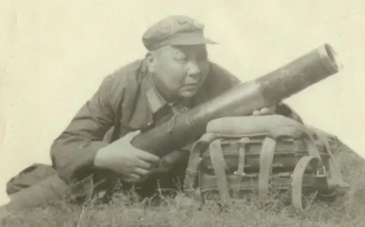 【已经升任解放军炮兵副司令员的赵章成,在演示徒手固定迫击炮瞄准】
