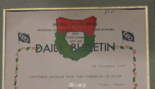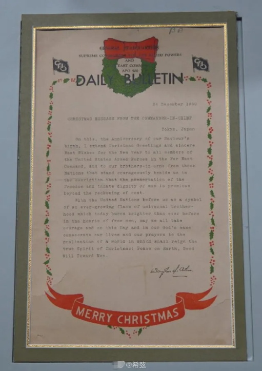 今年圣诞节,军博祭出1950年12月24日麦克阿瑟写给美军士兵的圣诞贺词,这还是当年的一份战利品。