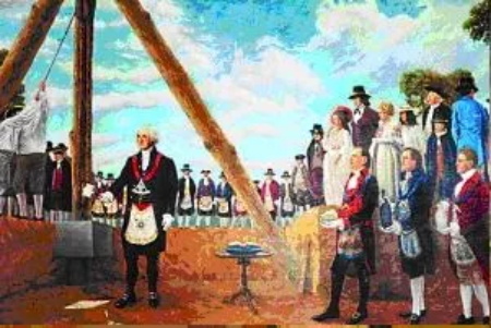 下图是共济会大长老乔治·华盛顿身着共济会的法服,围着法裙,在主持美国首都(华盛顿)的选址仪式: