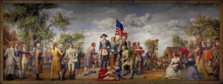 下图为总统乔治·华盛顿身穿共济会大长老教父的法服,主持美利坚首都建都的建城奠基典礼。这是当时仪式的纪实油画: