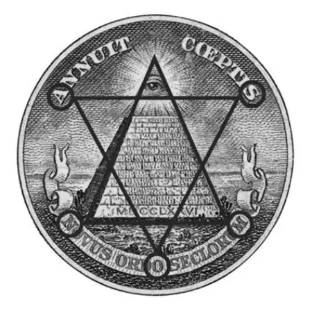图案中金字塔与3点连线组成的倒金字塔可以隐含地构成一个六角星徽,这正是犹太教中被称作“大卫星”或者“所罗门之印”的神秘象征物。