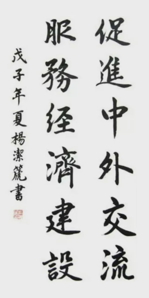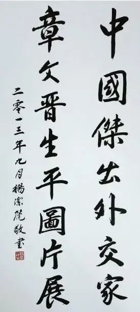 杨洁篪书法主要取法欧体,兼学王羲之,其书法水平在领导中是不多见的。
