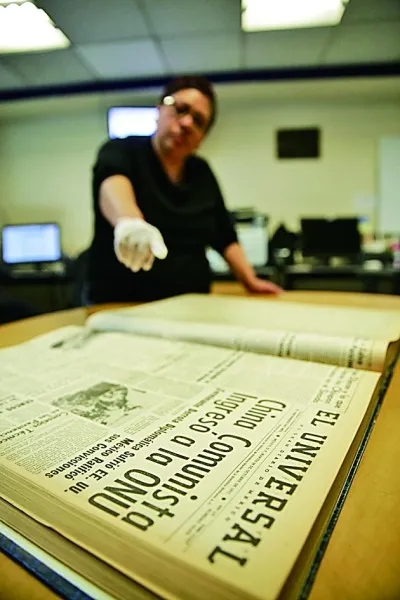 【2019年9月9日,墨西哥《宇宙报》阅览室员工介绍当年中国重返联合国的相关报道。新华社发】