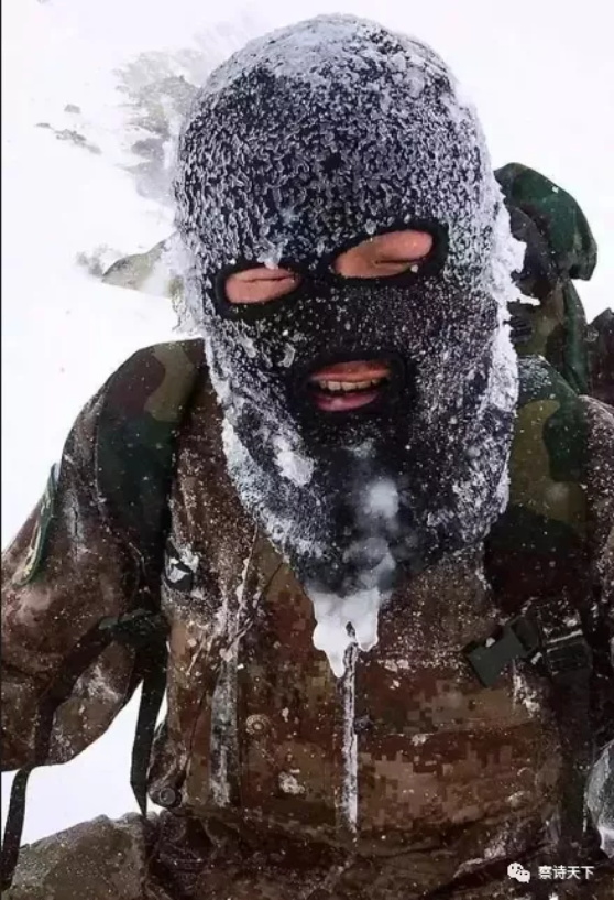 漫天飞雪,山里隆冬不觉寒。云掩弯月,晓风伴我夜戍边。银装素裹,北国风光情无限。钢枪授肩,定保神州永平安。
