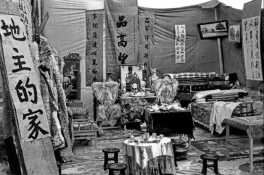 ▲民和县一区二乡为了教育农民,用对比的方式举办了一次实物展览。图为“地主的家”和“农民的家”。