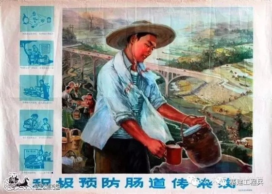 (积极预防肠道传染病:这张宣传画展示的是一位年轻的农民,正在用水壶向水杯中倒水,这是在提倡饮用热水,不喝生水,从而预防因喝生水引起的蛔虫病等肠道传染病)