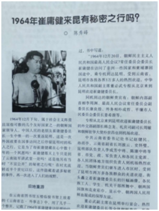 2017年底,笔者在一个微信群里发出了《朝鲜崔庸健何曾为唐继尧扫墓》文章,《陈文》作者在群里看到后,这个群里又发出了《1964年崔庸健来昆有秘密之行吗(正式修订稿)》。笔者又有机会与之进行磋商探讨。