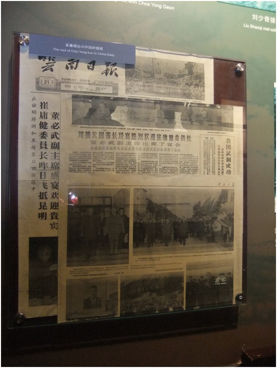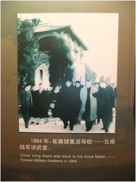 现在云南陆军讲武堂展览中有1964年12月21日崔庸健来昆明访问的照片,当时崔是朝鲜最高人民会议常任委员会委员长、政治军事地位仅次于金日成。鲜血凝成的中朝友谊使昆明人对朝鲜领导人充满敬爱之情,崔庸健来访问受到中国政府盛大欢迎,无论走到哪里都会引起人们的密切关注。省里组织大中专学校的学生排在街道两旁,从飞机场至外宾住宿的宾馆,举行盛大的夹道欢迎,笔者当年在读书,与同学们一道,手捧花束参加了夹道欢迎的队伍。