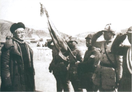 留守兵团司令员肖劲光(戴眼镜者)查看部队生产