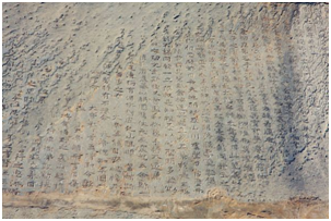 而第四节,即碑文第二石风化严重,但还可见部分文字。而第五节即碑文第三石因倒塌后石面(刻字面)埋于土中风化更为严重,已经完全没有文字。第六节即碑文第四石在1957年时亦尚存有少量文字,但风华更为严重。仅能依稀见到少量文字(见图四)。而第七节为该碑的底座,无文字。