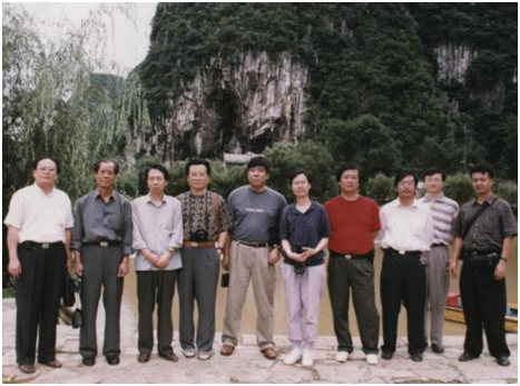 (贵州作家何士光(左三)等陪同西安作家陈忠实(左二)等考察团一行在龙宫留影。笔者右三)