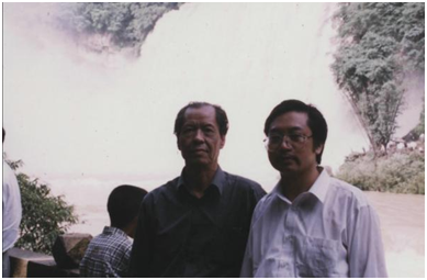 (笔者与陈忠实先生在黄果树瀑布下的留影)