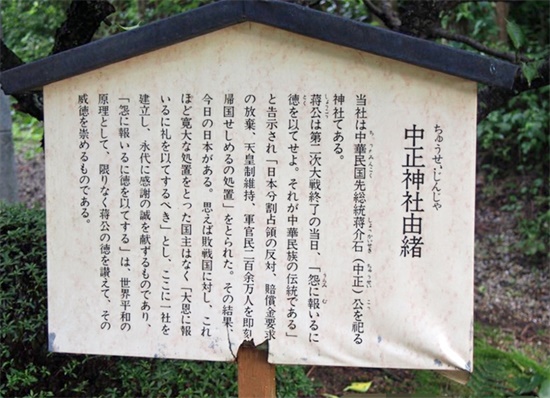 在日本人修葺的中正神社里面的碑文上铭刻到:大恩无以为报,特立斯社于此,以表诚之感谢,永世不忘!
