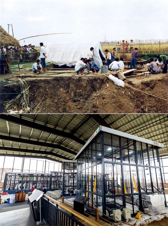 上图:1986年,考古人员在三星堆遗址考古发掘现场工作。受限于当时的条件,现场裸露在空气之中,没有被完全封闭保护起来。供图/三星堆博物馆下图:2021年3月10日,在三星堆遗址考古发掘现场拍摄的4个大小不同的“考古舱”。图/新华