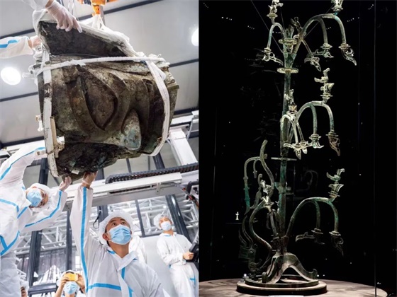 左图:三星堆131斤重的青铜大面具出土现场。供图/四川省文物考古研究院右图:三星堆出土的1号青铜神树。图/新华