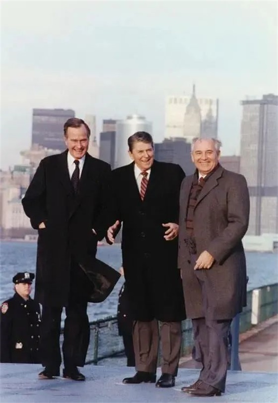 戈尔巴乔夫(右一)和里根(右二)相谈甚欢,谈笑风生