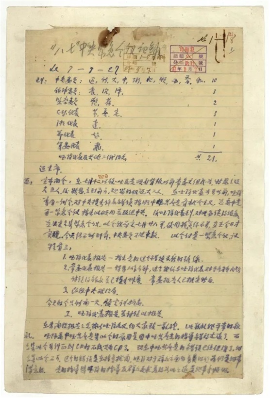 这是中央档案馆收藏的一份极为珍贵的档案。记录者在20页的横格纸上,以清晰简洁的笔触,记录了这次会议的全过程。