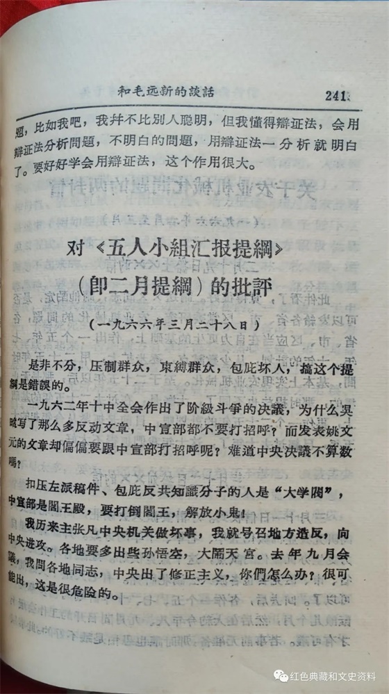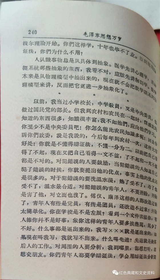 以前,我当过小学校长,中学教員,又是中央委员,也做过国民党的部长。但我到农村和农民在一起时,深感农民知道的东西很多,知识很丰富,我不如他們,应向他們学习,你至少不是中央委員吧!你怎么能比农民知识多呢!回去告訴你們政委,說是我說的,今后每年到农村一次,这样大有好处!你就是不懂得辩证法,不懂一分为二。以前把自己看得了不起,現在又把自己看得一文不值,了不起和一文不值都是不对的。 对犯錯誤的人要鼓励,当犯錯誤的人知道自己犯了錯誤的时候,你就要提出他的优点,事实上他的优点还是很多的。对于犯錯誤的要洗溫水澡,热了受不了,冷了也受不了,温水最合适。对犯錯誤的青年人,不要开除,开除是害了他,对立面也沒了。傅仪、康泽这样的人都改造过来了,青年人有些是党员,有些是团员,还改造不过来?开除太筒单化。你在学校是不是左派?看到一个文件表扬你,有人捧你并不是好事,象你这样的青年人要多挨些骂,骂少了不好。什么事都是逼出来的,我写×××就是逼出来的,如果現在叫我写,我就写不出来。什么叫先进?先进就是做落后人的工作。对周围的人要分析,我到哪里,都想打听,都想交朋友。你們青年人都要学辩证法,学会用辩证法分析问题,比如我吧,我并不比别人聪明,但我懂得辩证法,会用辩证法分析问题,不明白的问题,用辩证法一分析就明白了。要好好学会用辩证法,这个作用很大。