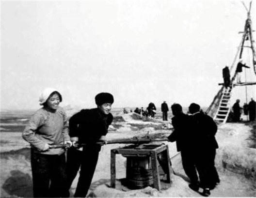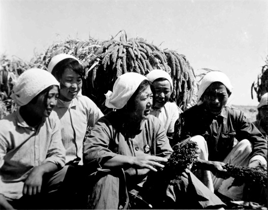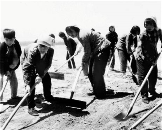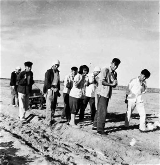 吕玉兰和农业生产合作社社员们用人工犁地抢种。
