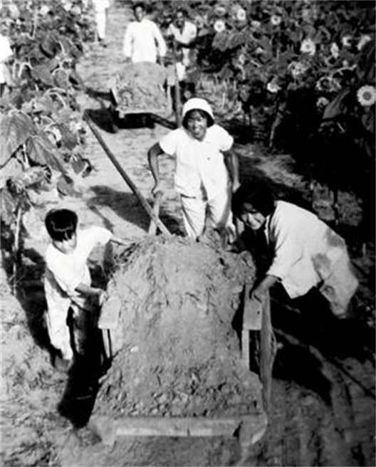吕玉兰和农业生产合作社社员们在一起平整土地。