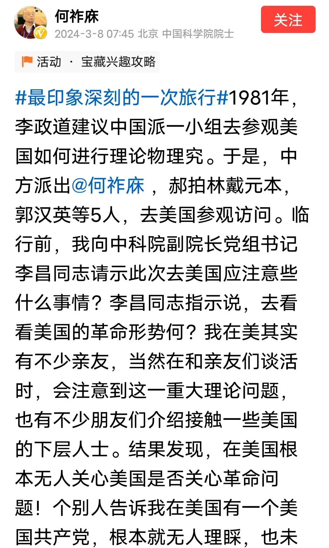 何院士回忆的这次美国之行,的确是存在的,那是1980年,不是他说的1981年,可能是他记错了。他在物理理论研究所干副所长,许多事情不懂,于是被派去美国学习人家美国是如何进行理论物理研究的。
