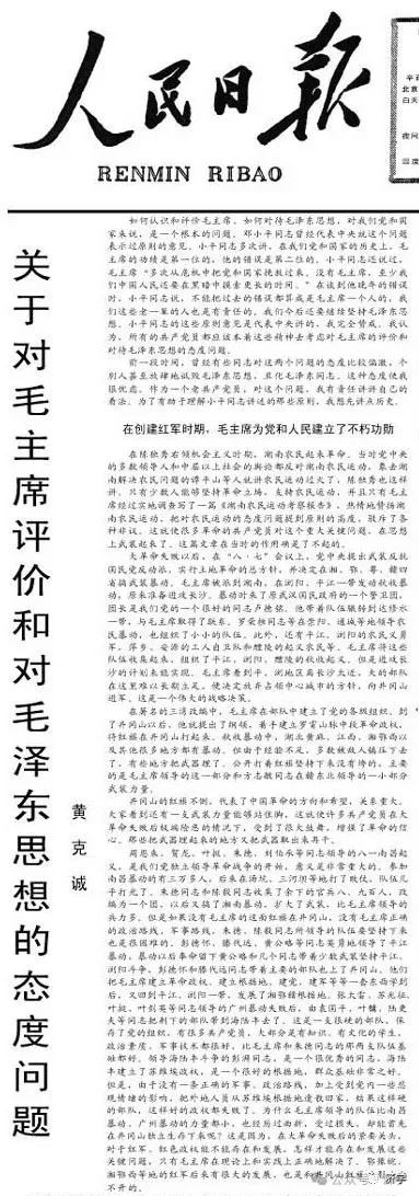 黄克诚听后点头说:“这个情况我也有所耳闻!很多人不理解,为什么很多复出的老干部对这种议论很着急。我们这代人对毛主席的感情,是超越个人恩怨的……” 在见到徐向前不说话后,黄克诚也是询问道:“徐帅,你怎么一言不发?” 徐向前说:“李先念同志说的就是我想要说的,毛主席的丰功伟绩,任谁也抹杀不了!” 接着大家说出了前来看望黄克诚的原因:“希望您站出来说句话,您的威望和影响无人能比。您出来讲话, 有利于统一全党的思想啊!” 黄克诚听后则反问道:“你们都在一线工作,为何你们不讲话?” 面对黄克诚的这个问题,徐向前元帅则回答说:“黄老啊,这个话我们也应该讲,但是您讲的和我们讲的不一样,您是挨整最厉害的,您讲出来的话更有力量,更容易澄清是非,扫清迷雾,统一全党的思想啊……” 黄克诚表态道:“你们等我再想想,我是一定会出来讲话!你们放心,我会坚持自己一向的原则,实事求是,不贬损毛主席,不贬损我们党……” 这个谈话,也许细节上难免有所出入,但从道层面讲,黄克诚和李先念、徐向前,那是心有灵犀一点通的。 后来黄克诚在中纪委上的那篇影响深远的讲话,为毛主席为党说话的那些说法是完全说得通的。 02 — 黄克诚的讲话不是个人行为 黄老的原话: 【如何认识和评价毛主席、如何对待毛泽东思想,对我们党和国家来说,是一个根本的问题。】 【前一段时间,曾经有些同志对这两个问题的态度比较偏激,个别人甚至放肆地诋毁......】 来源:济学微信号