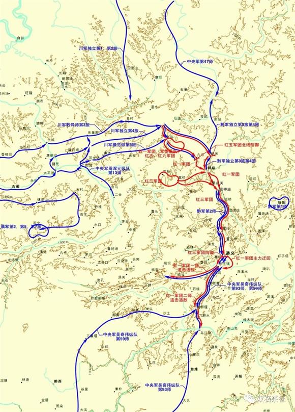 三、“敌军主力周浑元部”根本没有“紧随其后”,周纵队只有肖、谢两师正向大定前进,在中央红军东南侧隔老远,中间还隔着一条赤水河,周部主力要么还在乌江南岸向北岸转进中,要么还在守备贵阳!怎么可能“紧随其后”?作者难道没有耐心参照着地图多看看对手的部署和电文?】