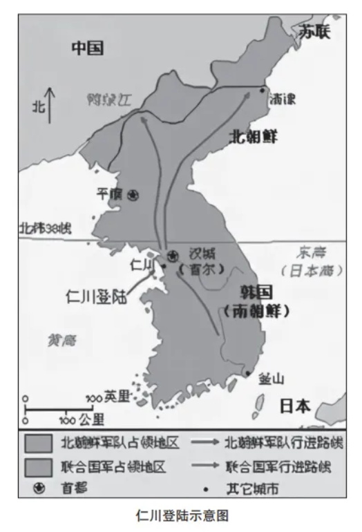 出其不意,美军实施仁川登陆。麦克阿瑟曾在太平洋战场指挥美军多次对日军后方实施登陆作战,他发明的“蛙跳”战术大获成功,一时间光环照身。