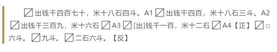 对比乌程汉简与玉门花海汉简中的“卖布踈”,两者的差异非常明显。乌程汉简“卖布踈”主要记录了卖布的数量和总价,支付的手段是钱;玉门花海汉简“卖布踈”记录了卖布的对象、数量、价格,支付的手段是谷物粮食。汉代进行支付时,货币和实物是并存的,“财政的支付手段,除了货币以外,还有粮谷、缣帛等实物”。从中我们可看出汉代“卖布踈”的格式似乎并不统一,各个区域有着自己的特点。