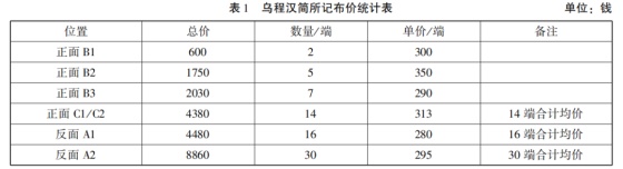 从表中我们可以大体知晓每端布的价格,最低价是280钱/端,最高价是350钱/端,均价305钱/端。这些布价数据为研究汉代经济史提供了资料。遗憾的是乌程汉简是以“端”作为计量单位,而非常见的“匹”,这使得我们很难与其他资料进行对比。关于乌程汉简卖布的主体,我们推测是商贾。相关资料出现在乌程县廷文书中,可能是由于官府对卖布活动进行征税而遗留下来的。