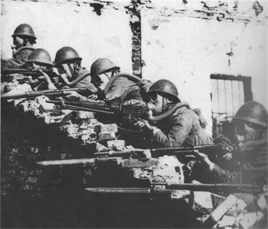 ◆在淞沪作战中,日军施放毒气后,带着防毒面具与中国军队作战。